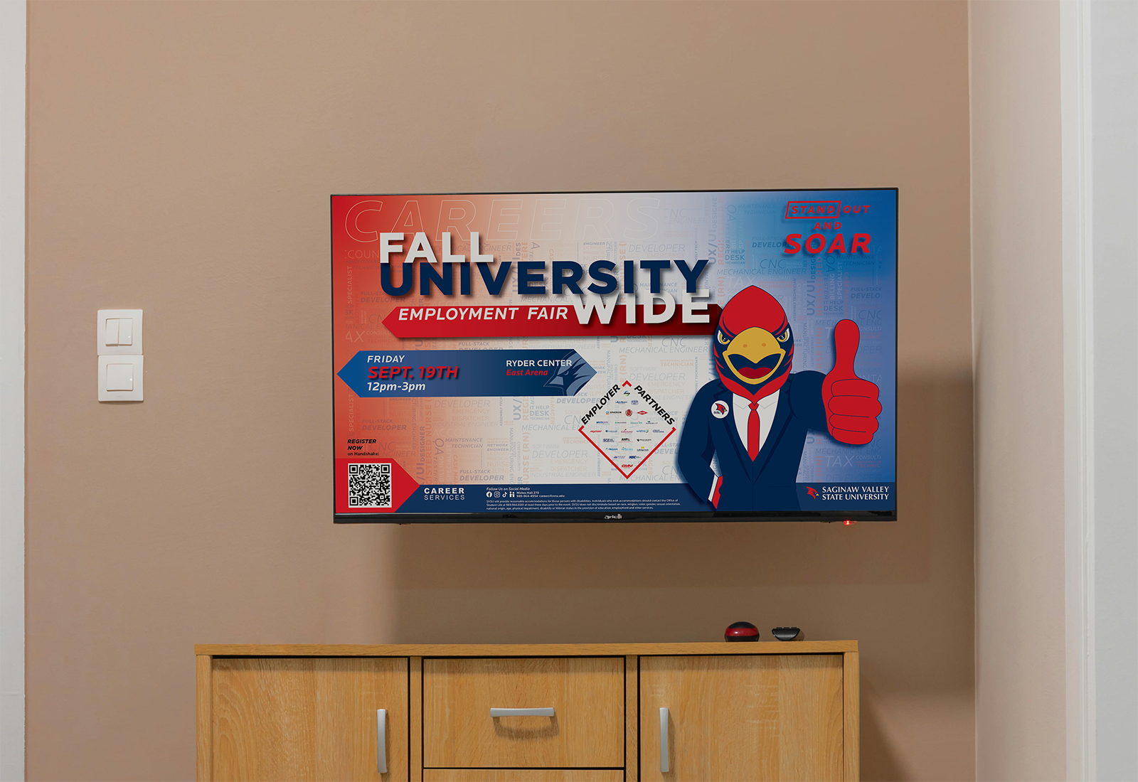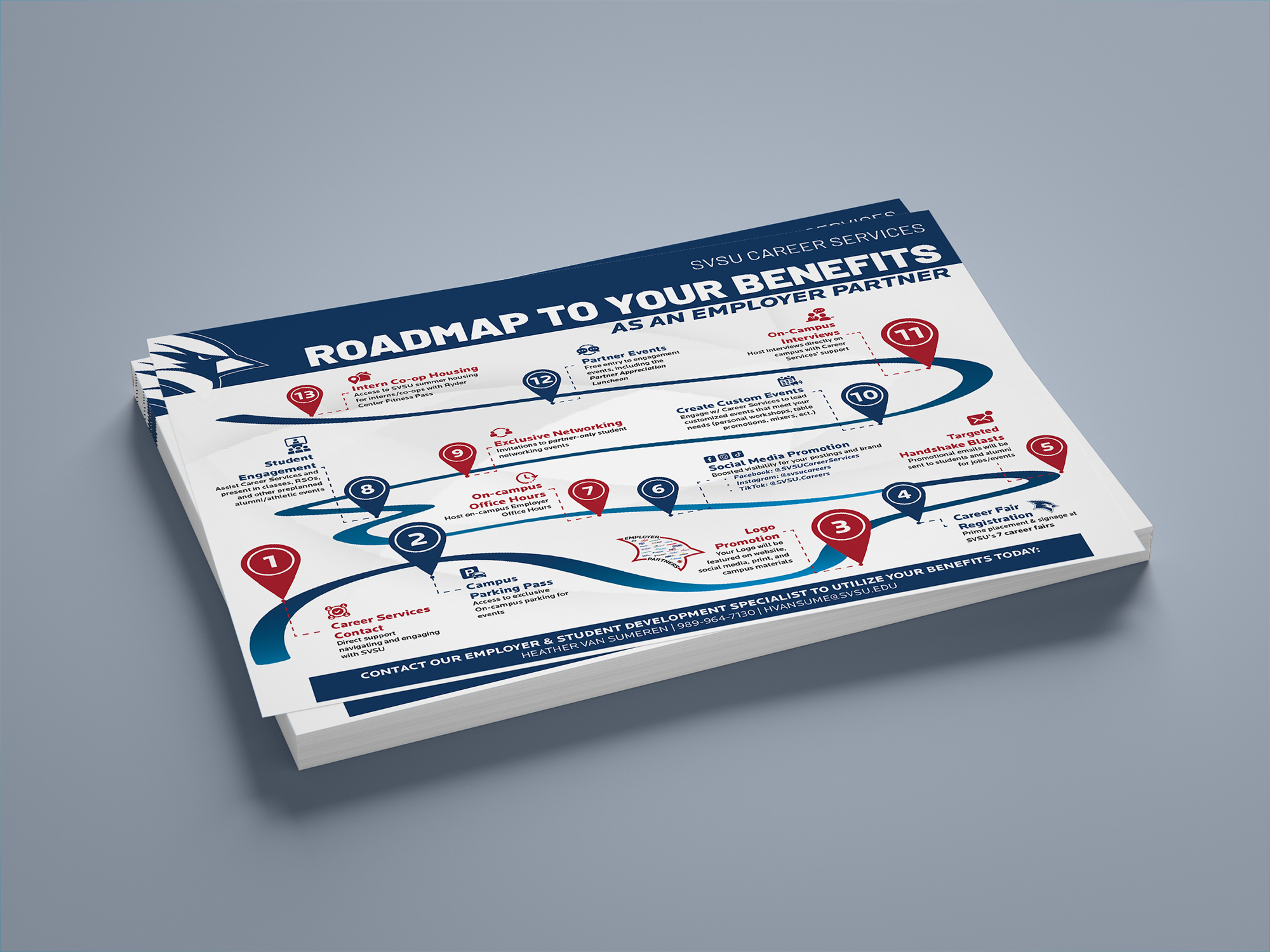 Career Services supports SVSU students with career development—resume and portfolio reviews, mock interviews, and connections to employers through on-campus fairs and programs. As the graphic design intern, I produced print and environmental materials for these initiatives, including fair campaigns, partner communications, and event signage. Every piece follows SVSU brand standards for clarity and recognition.