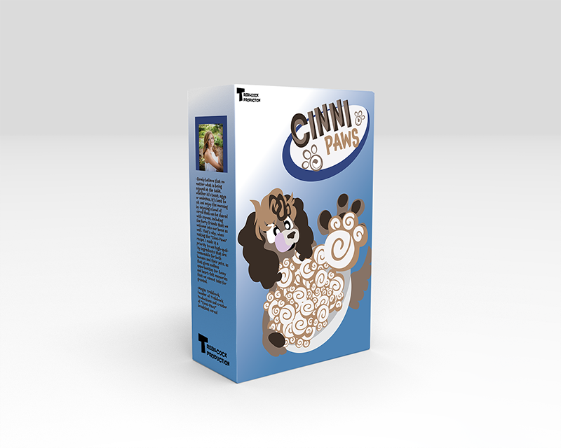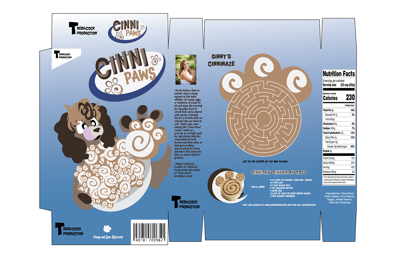 Packaging concept for “Cinnapaws,” a cinnamon cereal. I created the die-line, illustrated the mascot (“Ginny” the cocker spaniel), and built front/back panels and brand marks.